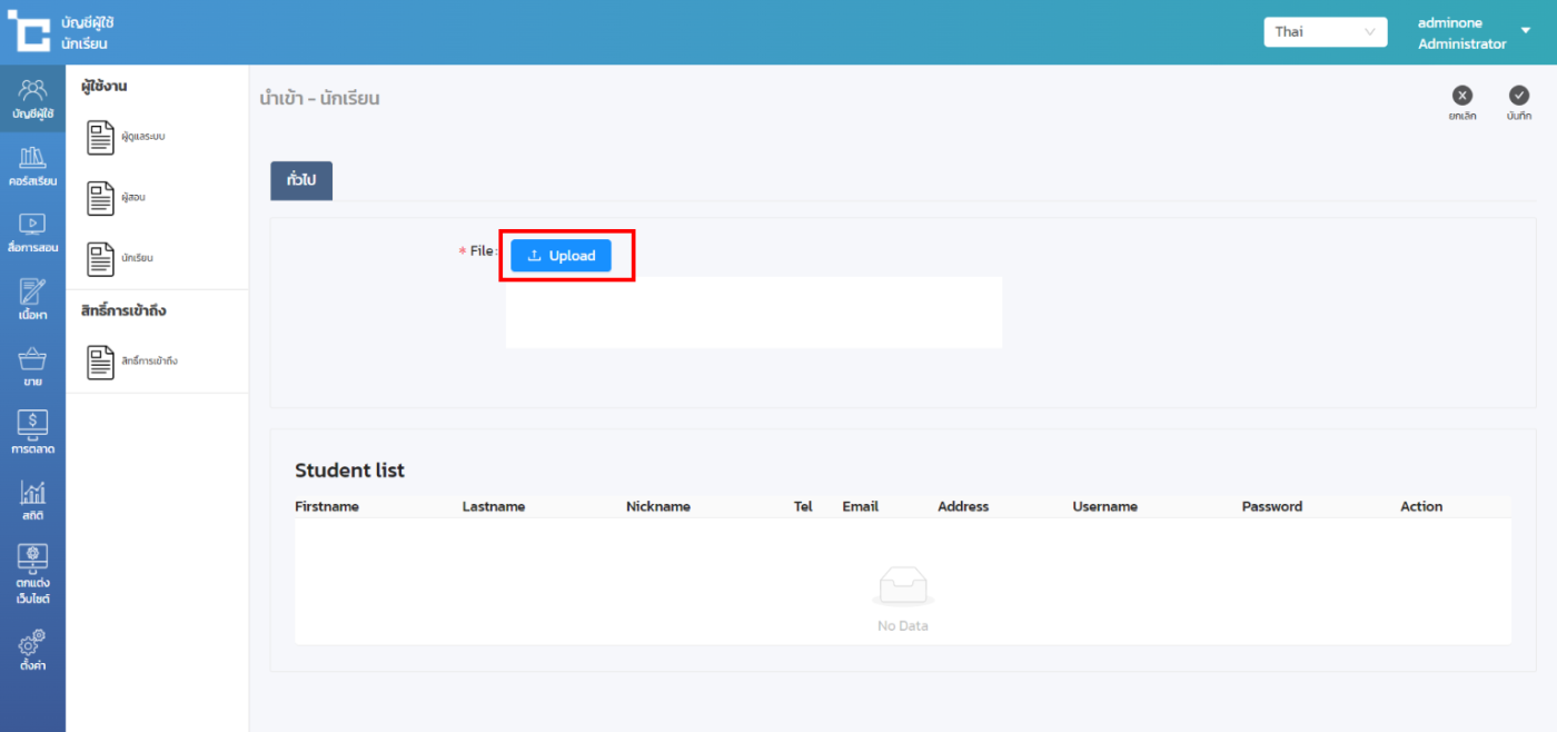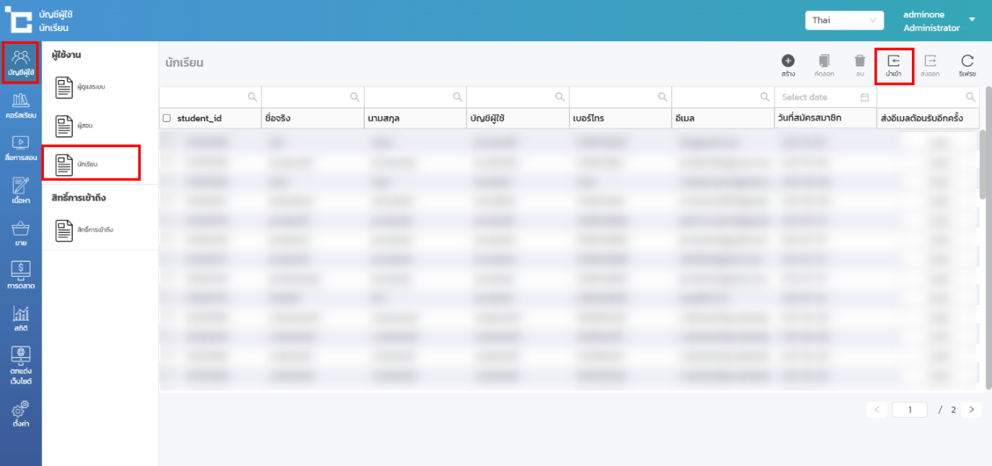 - ไปที่เมนู บัญชีผู้ใช้ > นักเรียน > นำเข้า