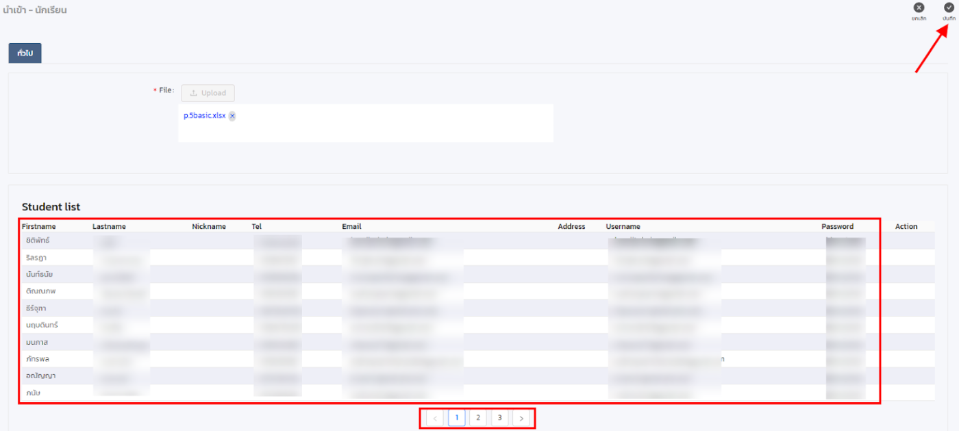 - เมื่ออัพโหลดไฟล์แล้ว ข้อมูลในไฟล์จะเเสดงเป็นตาราง ข้อมูลผู้เรียนที่ด้านล่าง ให้ทำการตรวจสอบความเรียบร้อย > บันทึก
