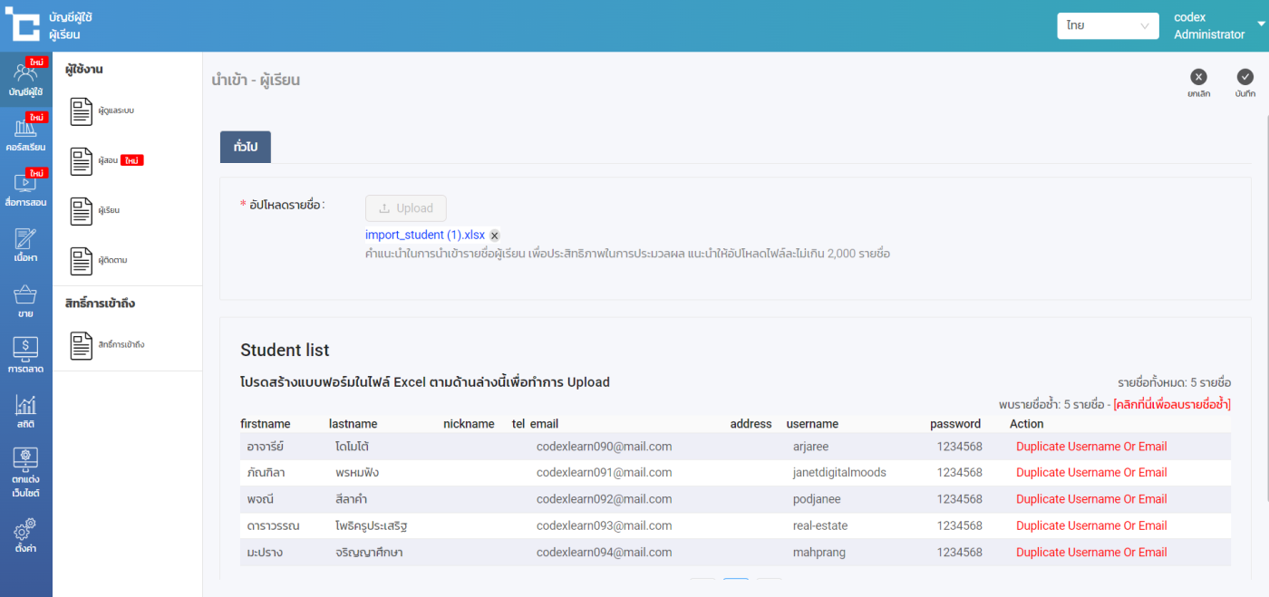 - หากมีข้อมูลซ้ำกันในไฟล์ ได้แก่ Email หรือ Username ซ้ำ 2 รายชื่อ ระบบจะตัดออก 1 รายชื่อ โดยเหลือเพียง 1 รายชื่ออัตโนมัติ