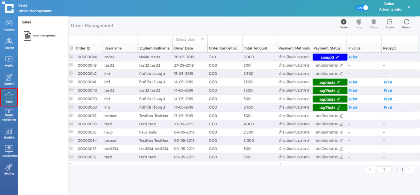 5. Sales เมนูการจัดการเกี่ยวกับการขายคอร์สเรียน ประกอบไปด้วย