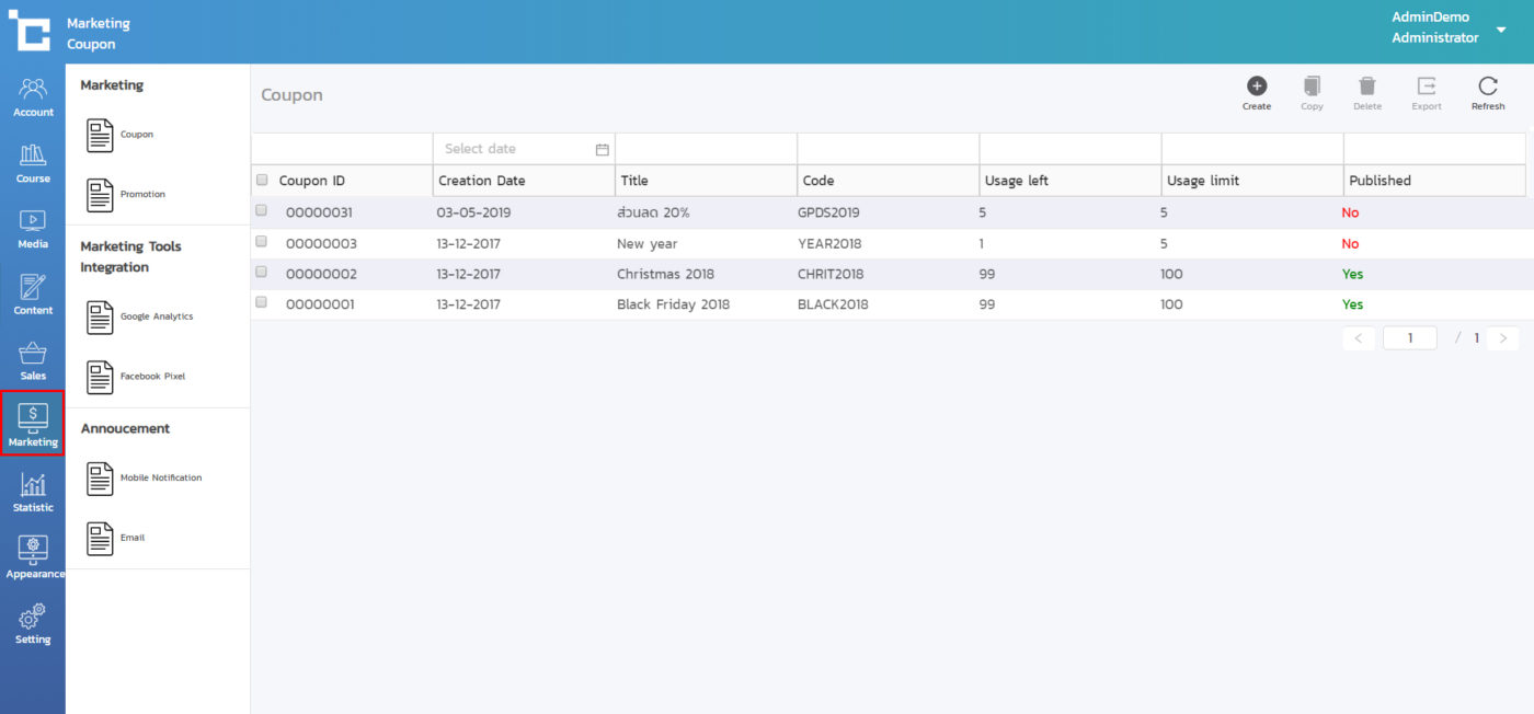 - Coupon การสร้างรหัสคูปอง สำหรับส่วนลดการซื้อคอร์ส