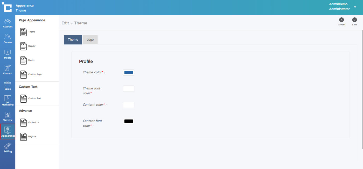 - Theme การกำหนดรูปแบบสีของเว็บไซต์ สีตัวอักษร โลโก้ของเว็บไซต์ (ดูวิธีการตกแต่งธีมสี คลิกที่นี่)