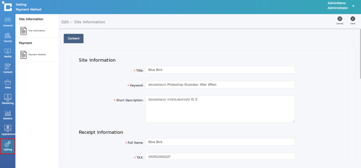 - Site Information ข้อมูลพื้นฐาน ที่จะถูกดึงไปใช้ทั้งเว็บไซต์ (ดูวิธีการใช้งาน คลิกที่นี่ )