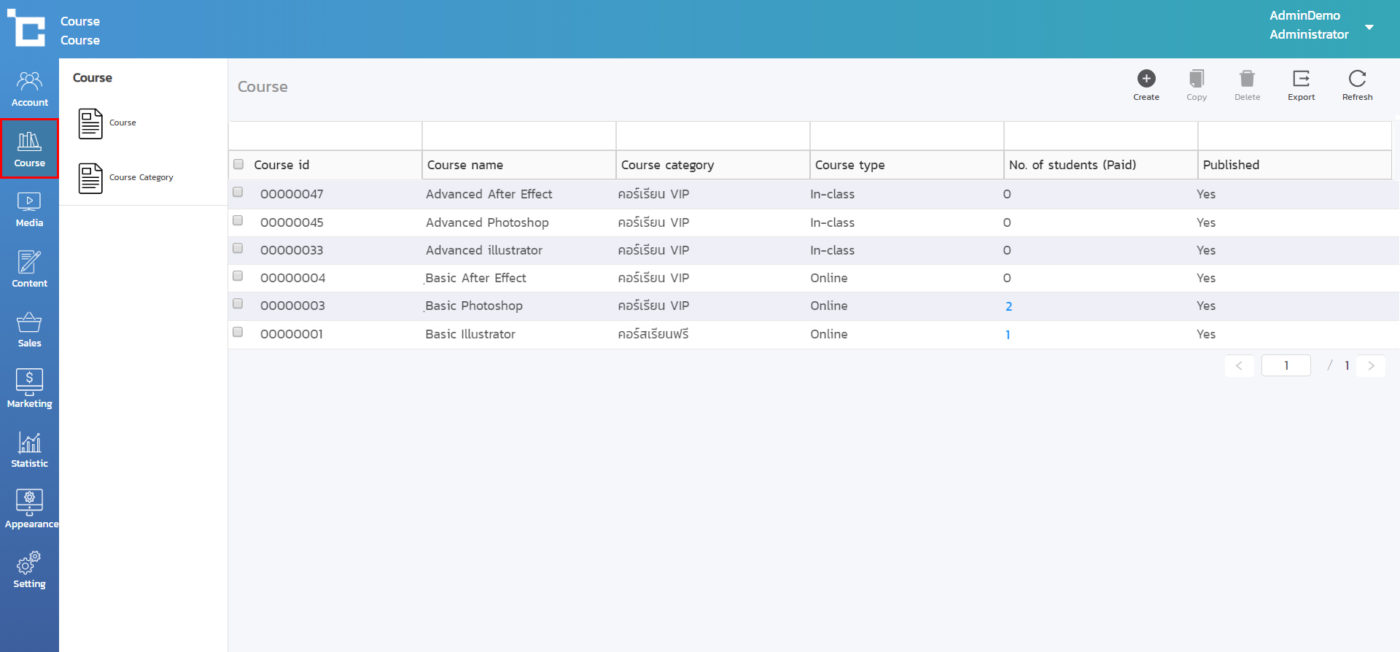 2. Course เมนูสำหรับการสร้างคอร์สเรียน และหมวดหมู่ของคอร์สเรียน ประกอบด้วย