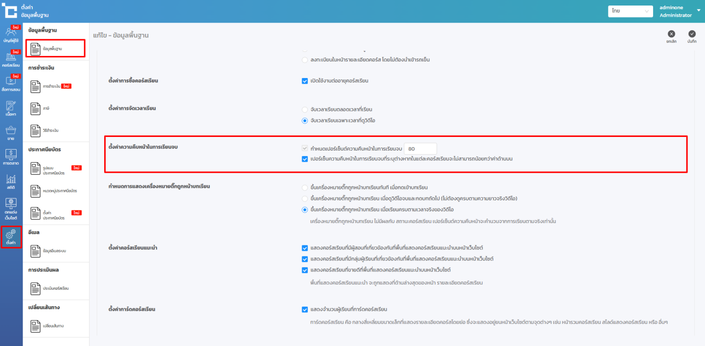 เมนูการตั้งค่า > ข้อมูลพื้นฐาน > การตั้งค่า > ตั้งค่าความคืบหน้าในการเรียนจบ