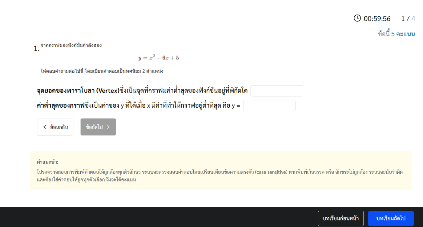 หมายเหตุ: รูปแบบคำตอบต้องเป็นตัวเลข หรือ ทศนิยมเท่านั้น ไม่รองรับตัวอักษรหรือสัญลักษณ์อื่น
