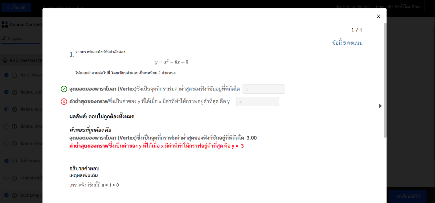 สำหรับการตอบคำถามของผู้เรียน จะเป็นการพิมพ์คำตอบตัวเลขลงไปในช่อง แต่หากเป็นตัวเลขที่มีทศนิยม ที่ลงท้ายด้วย .00 เช่น 3.00 แต่ผู้เรียนพิมพ์ตอบคำถามเป็น 3 ระบบจะถือว่าผ่านค่ะ