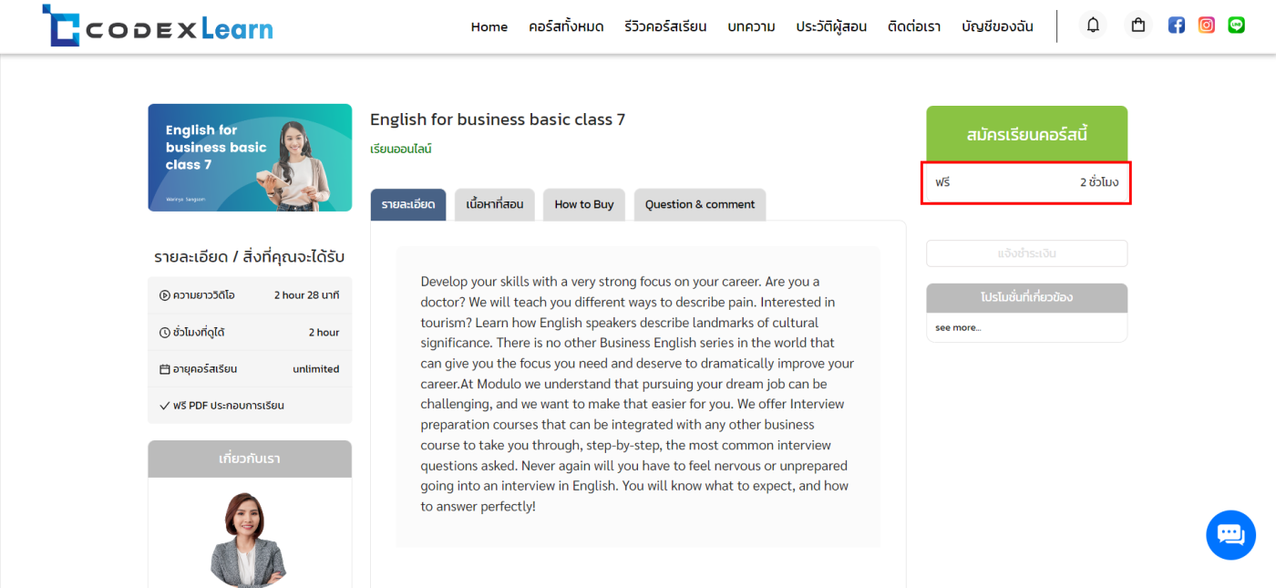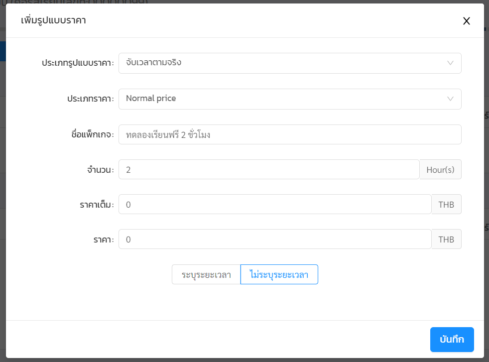 - สามารถสร้างเป็น คอร์สทดลองเรียนฟรี ได้ โดยทำการตั้งรูปแบบราคาทั่วไป เป็นแบบจับเวลาตามจริง และตั้งราคาเป็น 0 บาท เช่น เรียนฟรี 2 ชั่วโมง โดยหากมีการตั้งรูปแบบราคาคอร์สเรียนเป็น 0 บาท ระบบจะแสดงผลว่าเป็นคอร์สเรียนฟรี โดยอัตโนมัติ