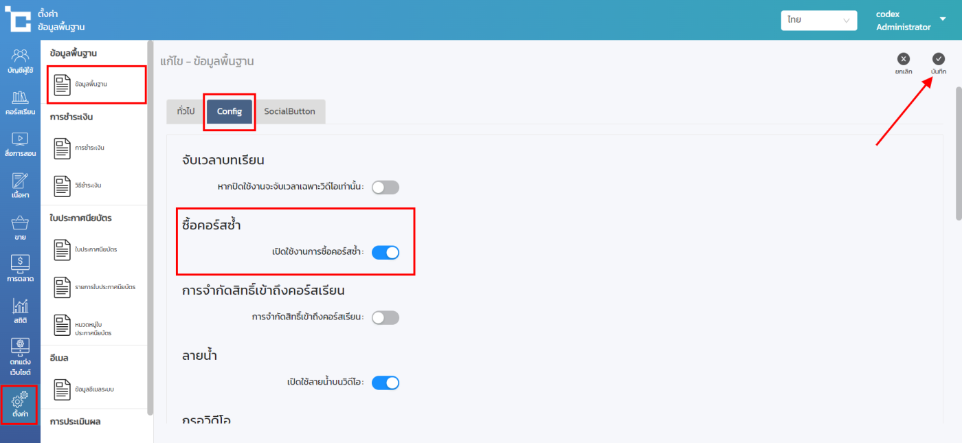 ขั้นตอนที่ 1 : ทำการเปิดการใช้งานฟังก์ชั่น โดยไปที่ ตั้งค่า > ข้อมูลพื้นฐาน > Config > เปิดใช้งานการซื้อคอร์สซ้ำ > บันทึก