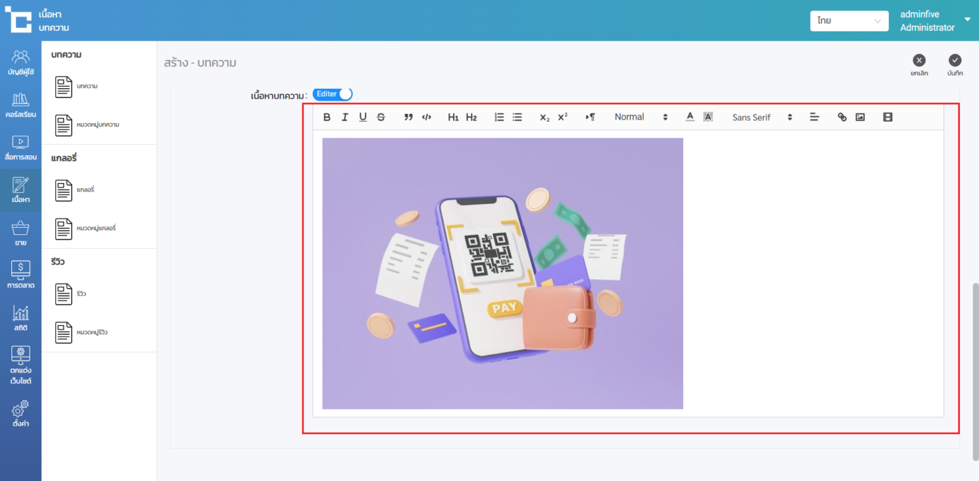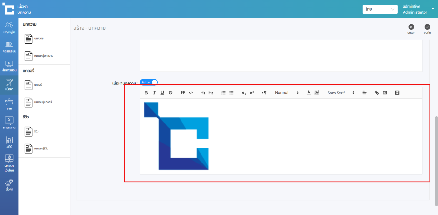 Text Editor สามารถใช้ได้ทั้งการกรอกข้อความแทรกลิงค์ วิดีโอ รูปภาพ เพิ่มไปยังบนเว็บไซต์ได้อย่างง่าย สามารถใช้งาน Text Editor ได้ทุกหน้าที่มีตัวกล่อง Text Editor สำหรับการแทรกด้วยรูปภาพสามารถทำได้ตามขั้นตอนต่อไปนี้