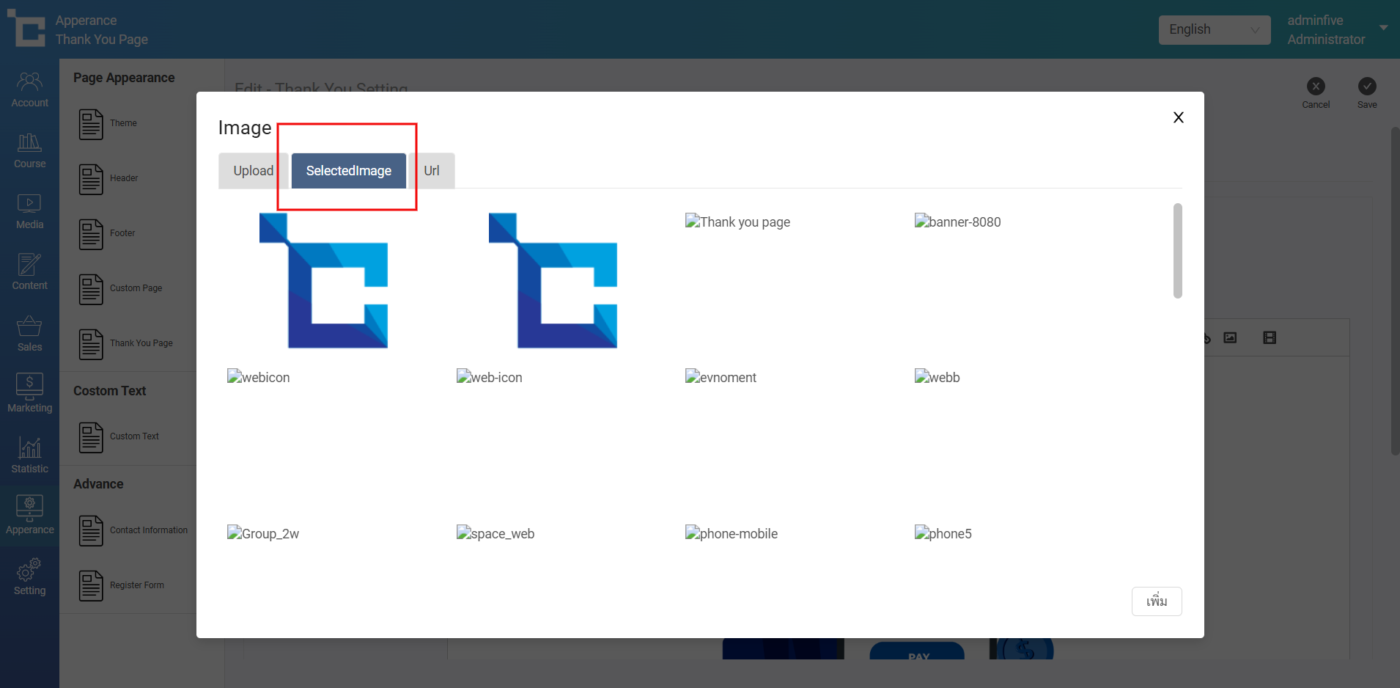 หน้า Selected Image เมื่อทำการอัพโหลดรูปภาพแล้ว รูปภาพจะมาแสดงบนหน้า Selected Image และสามารถนำรูปภาพจากที่นี้ไปใช้ได้เลยโดยคลิกที่รูปภาพและกดเพิ่ม