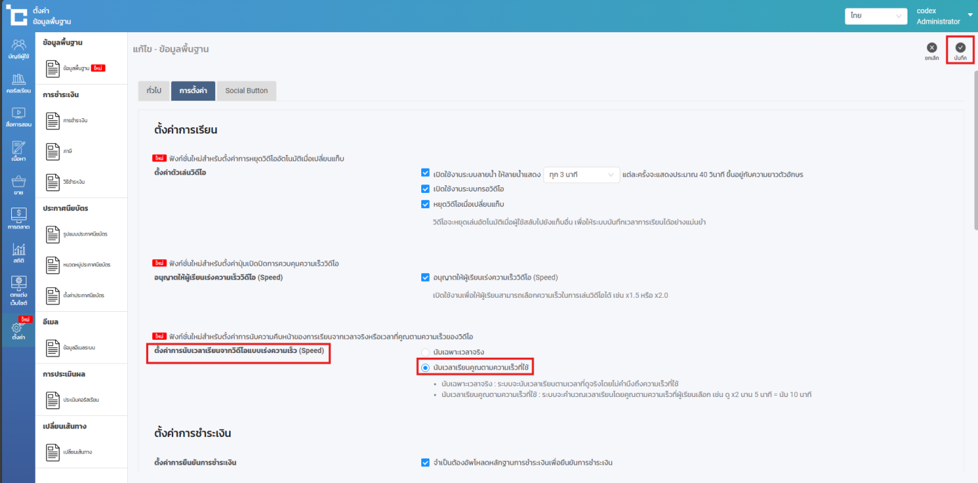ต่อมาให้คุณไปที่ ตั้งค่าการนับเวลาเรียนจากวิดีโอแบบเร่งความเร็ว > กดติ๊กหน้าช่อง นับเวลาเรียนคูณตามความเร็วที่ใช้ > กด บันทึก
