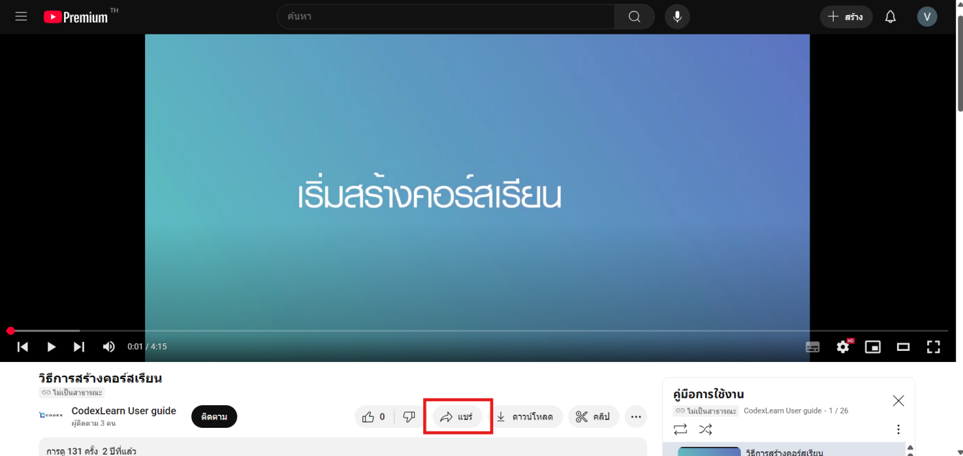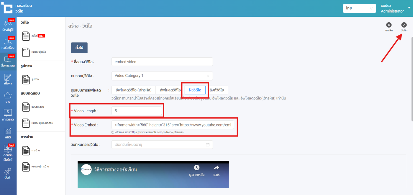 หมายเหตุ : การใช้วิดีโอจาก YouTube หรือ วิดีโอที่ไม่ได้อัพโหลดจากระบบจะไม่สามารถใช้งานระบบได้อย่างเต็มประสิทธิภาพ เช่น การแทร็คเวลาที่ผู้เรียนดูวิดีโอจริง การใช้งาน interactive video quiz เป็นต้น